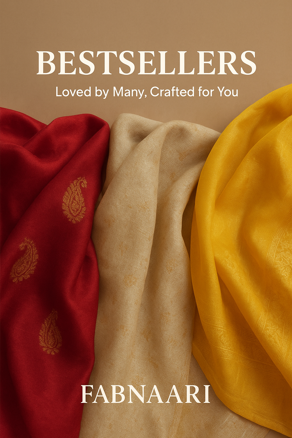 Explore FabNaari’s most loved fabrics that have won hearts time and again. From the effortless grace of Saadgi to the festive glow of Jashn and the regal charm of Shehnai, our bestsellers bring together timeless styles and unmatched quality. These are the fabrics our customers keep coming back for — and they might just become your favorites too.