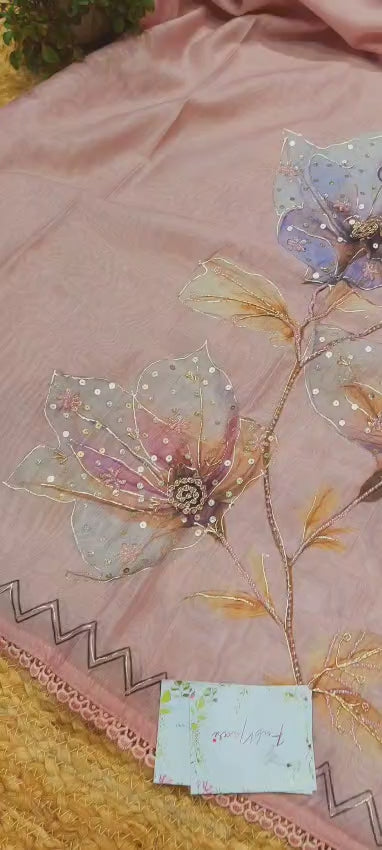 A soft Chanderi silk suit adorned with hand-painted florals with fine embroidery. Paired with a lightweight floral-printed dupatta finished with lace, and shantoon bottoms for everyday grace with a festive touch.