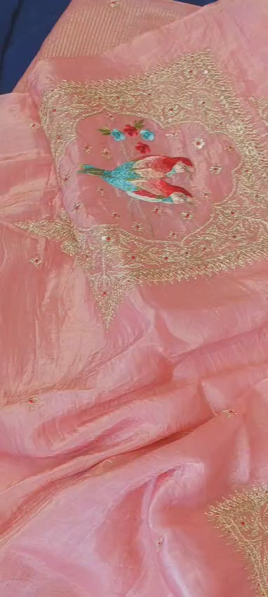 A regal piece from our Shehnai Collection, this Tissue Crepe suit fabric radiates grace and luxury. The kameez is adorned with red-golden bird motifs intricately embroidered, adding a festive richness. Paired with a crushed crepe dupatta having bird motifs as well for a flowing drape along with soft crepe lower, it blends tradition with effortless sophistication — perfect for weddings and celebrations.